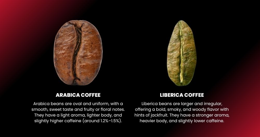 Liberica has much larger beans and a lower caffeine content than Robusta. Unlike Arabica’s acidity, Liberica is known for its heavy body, woody aroma, and “wild” flavor notes like jackfruit.